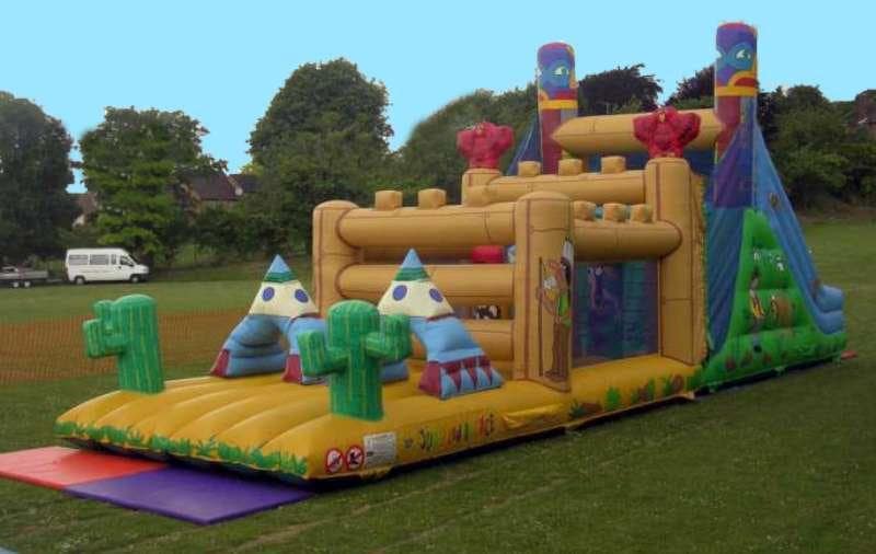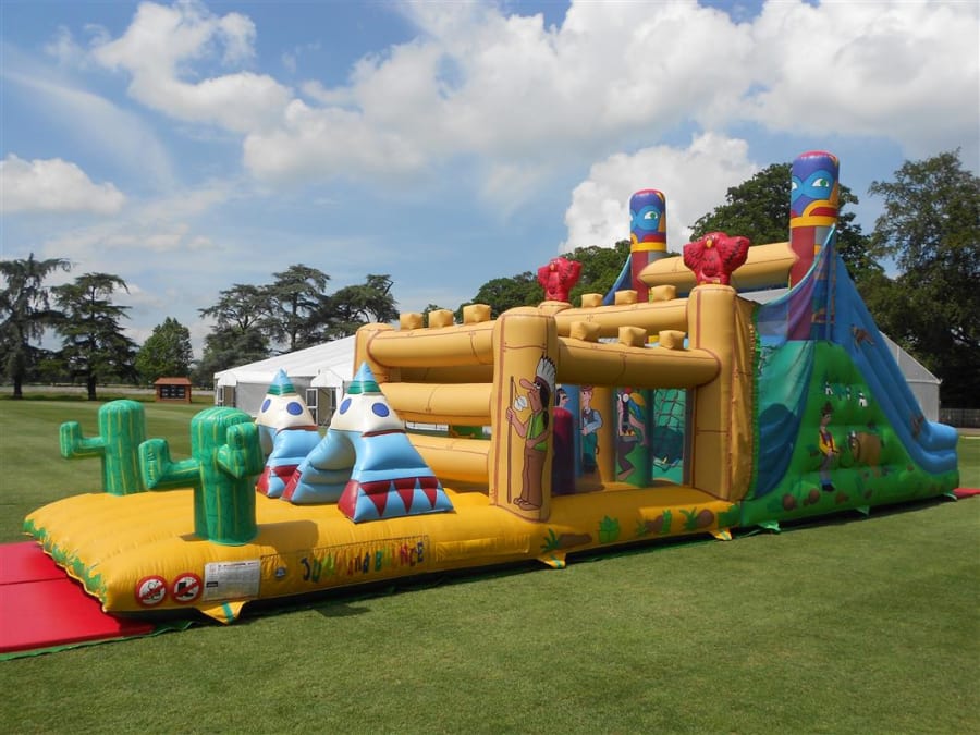 Have you ever wanted to be a Cowboy or Red Indian? Well now is your chance! On this assault course there are wigwams, a scramble net, bounce area, squeeze through, biff-bash, and a 2 metre high slide. Complemented by inflatable cactus trees, totem poles and a tipi theme.
